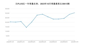2023年10月,元PLUS销量为30615辆,同比增长49.94%,环比增长6.57%。2022年10月-2023年10月份,元PLUS销量为309769辆,同比增长145.55%。