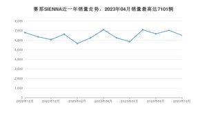 2023年10月,赛那SIENNA销量为6505辆,同比下降4.37%,环比下降7.49%。2022年10月-2023年10月份,赛那SIENNA销量为84226辆,同比增长35.74%。