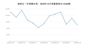 2023年10月,威朗销量为7365辆,同比下降45.34%,环比下降30.94%。2022年10月-2023年10月份,威朗销量为135643辆,同比增长24.07%。