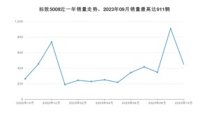 2023年10月,标致5008销量为447辆,同比增长69.96%,环比下降50.93%。2022年10月-2023年10月份,标致5008销量为5043辆,同比下降16.63%。