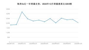 2023年10月,瑞虎5x销量为2047辆,同比增长12.91%,环比下降15.27%。2022年10月-2023年10月份,瑞虎5x销量为29938辆,同比下降31.34%。
