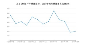 2023年10月,启辰D60销量为200辆,同比下降64.09%,环比增长12.36%。2022年10月-2023年10月份,启辰D60销量为5336辆,同比下降66.68%。