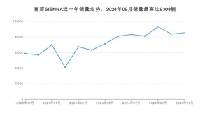 2024年11月,赛那SIENNA销量为8543辆,同比增长45.64%,环比增长2.02%。2023年11月-2024年11月份,赛那SIENNA销量为93561辆,同比增长12.33%。