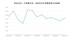 2024年11月,奥迪A3销量为4352辆,同比下降8.46%,环比增长24.02%。2023年11月-2024年11月份,奥迪A3销量为60066辆,同比下降11.66%。