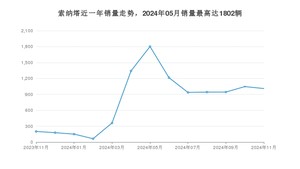 2024年11月,索纳塔销量为1010辆,同比增长402.49%,环比下降3.53%。2023年11月-2024年11月份,索纳塔销量为10195辆,同比增长172.89%。
