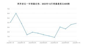 2024年11月,探界者销量为389辆,同比下降5.58%,环比增长8.06%。2023年11月-2024年11月份,探界者销量为3569辆,同比下降76.85%。