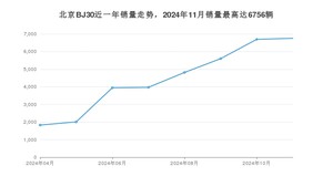 2024年11月,北京BJ30销量为6756辆,环比增长0.88%。2023年11月-2024年11月份,北京BJ30销量为35625辆,