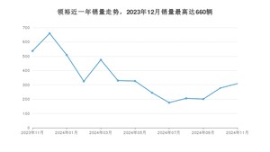 2024年11月,领裕销量为309辆,同比下降42.46%,环比增长11.15%。2023年11月-2024年11月份,领裕销量为4578辆,同比下降36.12%。