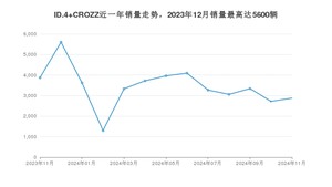 2024年11月,ID.4 CROZZ销量为2878辆,同比下降25.67%,环比增长5.77%。2023年11月-2024年11月份,ID.4 CROZZ销量为44779辆,同比增长13.23%。