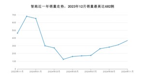2024年11月,智跑销量为369辆,同比下降20.47%,环比增长17.89%。2023年11月-2024年11月份,智跑销量为4231辆,同比下降69.1%。