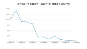 2024年11月,元Pro销量为22辆,同比下降98.23%,环比下降35.29%。2023年11月-2024年11月份,元Pro销量为7181辆,同比下降25.79%。