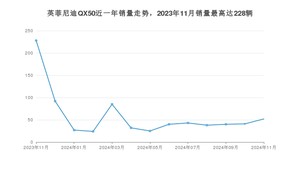 2024年11月,英菲尼迪QX50销量为52辆,同比下降77.19%,环比增长26.83%。2023年11月-2024年11月份,英菲尼迪QX50销量为767辆,同比下降63.18%。