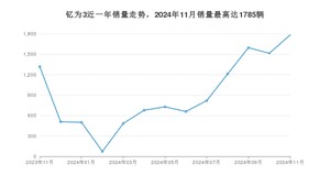 2024年11月,钇为3销量为1785辆,同比增长35.43%,环比增长17.9%。2023年11月-2024年11月份,钇为3销量为11874辆,同比增长9.2%。
