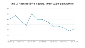 2024年11月,奥迪Q3 Sportback销量为221辆,同比下降46.62%,环比增长24.86%。2023年11月-2024年11月份,奥迪Q3 Sportback销量为4335辆,同比下降45.85%。
