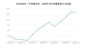 2024年11月,启辰D60销量为1601辆,同比增长525.39%,环比下降2.62%。2023年11月-2024年11月份,启辰D60销量为9898辆,同比增长96.58%。