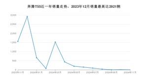 2024年11月,奔腾T55销量为2辆,同比下降99.87%,环比下降77.78%。2023年11月-2024年11月份,奔腾T55销量为7658辆,同比下降3.7%。