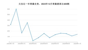 2024年11月,元宝销量为142辆,同比下降55.06%,环比增长27.93%。2023年11月-2024年11月份,元宝销量为2475辆,同比下降69.85%。
