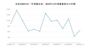 2024年11月,启辰D60EV销量为684辆,同比下降35.77%,环比增长97.12%。2023年11月-2024年11月份,启辰D60EV销量为13034辆,同比下降39.45%。