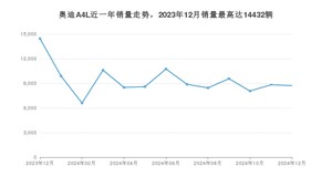 2024年12月,奥迪A4L销量为8717辆,同比下降39.6%,环比下降1.2%。2023年12月-2024年12月份,奥迪A4L销量为121829辆,同比下降16.31%。