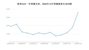 2024年12月,瑞虎5x销量为3633辆,同比增长91.61%,环比增长99.94%。2023年12月-2024年12月份,瑞虎5x销量为18715辆,同比下降38.96%。