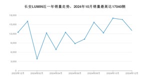 2024年12月,长安LUMIN销量为13027辆,同比增长4.38%,环比下降21.55%。2023年12月-2024年12月份,长安LUMIN销量为157622辆,同比增长4.72%。