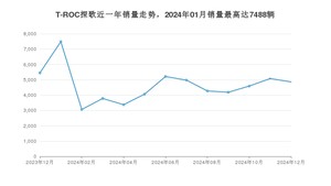 2024年12月,T-ROC探歌销量为4861辆,同比下降10.79%,环比下降4.31%。2023年12月-2024年12月份,T-ROC探歌销量为60393辆,同比下降10.22%。