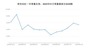 2024年12月,领克03销量为5345辆,同比下降13.79%,环比下降9.19%。2023年12月-2024年12月份,领克03销量为60766辆,同比下降20.54%。