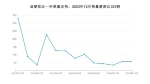 2024年12月,途睿欧销量为59辆,同比下降82.18%,环比增长1.72%。2023年12月-2024年12月份,途睿欧销量为1361辆,同比下降45.08%。
