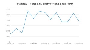 2024年12月,丰田bZ3销量为3740辆,同比增长143.33%,环比下降28.86%。2023年12月-2024年12月份,丰田bZ3销量为52468辆,同比增长102.37%。