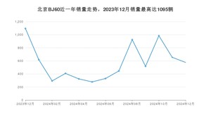 2024年12月,北京BJ60销量为576辆,同比下降47.4%,环比下降11.93%。2023年12月-2024年12月份,北京BJ60销量为7446辆,同比下降21.1%。