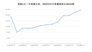 2025年1月,星越L销量为29434辆,同比增长25.86%,环比增长6.85%。2024年01月-2025年01月份,星越L销量为249326辆,同比增长35.89%。