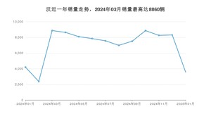 2025年1月,汉销量为3580辆,同比下降14.74%,环比下降56.89%。2024年01月-2025年01月份,汉销量为91009辆,同比下降38.03%。