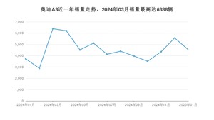 2025年1月,奥迪A3销量为4535辆,同比增长21.88%,环比下降18.64%。2024年01月-2025年01月份,奥迪A3销量为59296辆,同比下降12.37%。