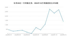 2025年1月,哈弗H9销量为1383辆,同比增长216.48%,环比下降49.36%。2024年01月-2025年01月份,哈弗H9销量为13034辆,同比增长109.25%。