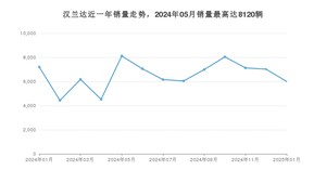 2025年1月,汉兰达销量为5999辆,同比下降16.73%,环比下降14.56%。2024年01月-2025年01月份,汉兰达销量为84883辆,同比增长5.26%。