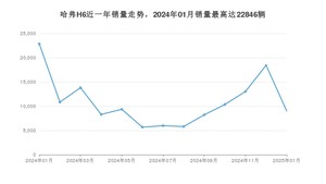 2025年1月,哈弗H6销量为9022辆,同比下降60.51%,环比下降51.07%。2024年01月-2025年01月份,哈弗H6销量为141720辆,同比下降41.22%。