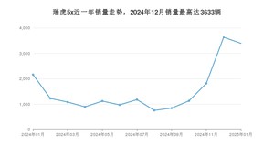 2025年1月,瑞虎5x销量为3393辆,同比增长56.87%,环比下降6.61%。2024年01月-2025年01月份,瑞虎5x销量为20212辆,同比下降31.76%。