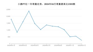 2025年1月,小鹏P7销量为243辆,同比下降86.37%,环比下降55.74%。2024年01月-2025年01月份,小鹏P7销量为15332辆,同比下降67.49%。