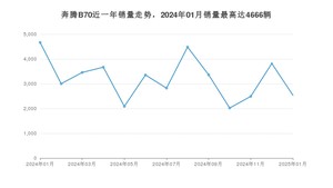 2025年1月,奔腾B70销量为2541辆,同比下降45.54%,环比下降33.45%。2024年01月-2025年01月份,奔腾B70销量为41768辆,同比下降11.27%。