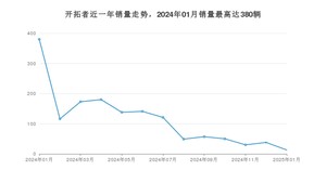 2025年1月,开拓者销量为13辆,同比下降96.58%,环比下降65.79%。2024年01月-2025年01月份,开拓者销量为1486辆,同比下降56.65%。