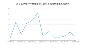 2025年1月,北京BJ80销量为2辆,同比下降33.33%,环比下降75%。2024年01月-2025年01月份,北京BJ80销量为119辆,同比下降70.69%。