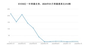 2025年1月,EVOS销量为5辆,同比下降97.66%,环比持平。2024年01月-2025年01月份,EVOS销量为897辆,同比下降66.13%。