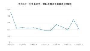 2025年1月,探岳X销量为398辆,同比下降55.68%,环比下降42.32%。2024年01月-2025年01月份,探岳X销量为6325辆,同比下降35.47%。