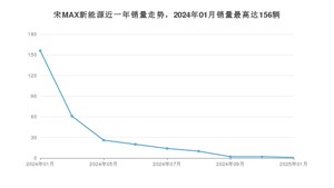 2025年1月,宋MAX新能源销量为1辆,同比下降99.36%,环比下降50%。2024年01月-2025年01月份,宋MAX新能源销量为292辆,同比下降92.47%。