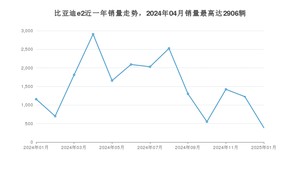 2025年1月,比亚迪e2销量为388辆,同比下降66.46%,环比下降68.3%。2024年01月-2025年01月份,比亚迪e2销量为19758辆,同比下降1.83%。
