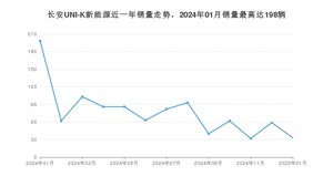 2025年1月,长安UNI-K新能源销量为33辆,同比下降83.33%,环比下降44.07%。2024年01月-2025年01月份,长安UNI-K新能源销量为999辆,同比下降87.22%。