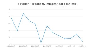 2025年1月,比亚迪D1销量为13辆,同比下降88.6%,环比下降70.45%。2024年01月-2025年01月份,比亚迪D1销量为786辆,同比下降14.57%。