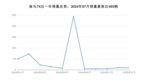 2025年1月,海马7X销量为19辆,同比下降80.81%,环比持平。2024年01月-2025年01月份,海马7X销量为883辆,同比下降82.45%。