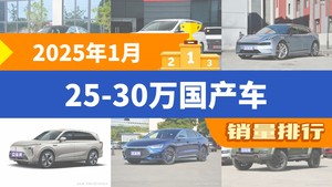 2025年1月25-30万国产车销量排行榜,领克03以8260辆夺冠,红旗HS7升至第9名