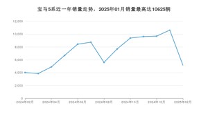 2025年2月,宝马5系销量为5159辆,同比增长28.37%,环比下降51.44%。2024年02月-2025年02月份,宝马5系销量为94416辆,同比下降25.02%。
